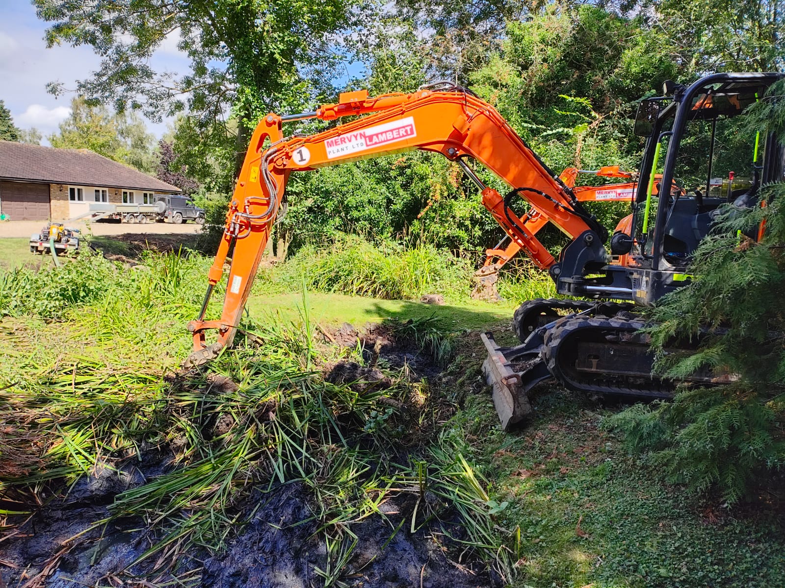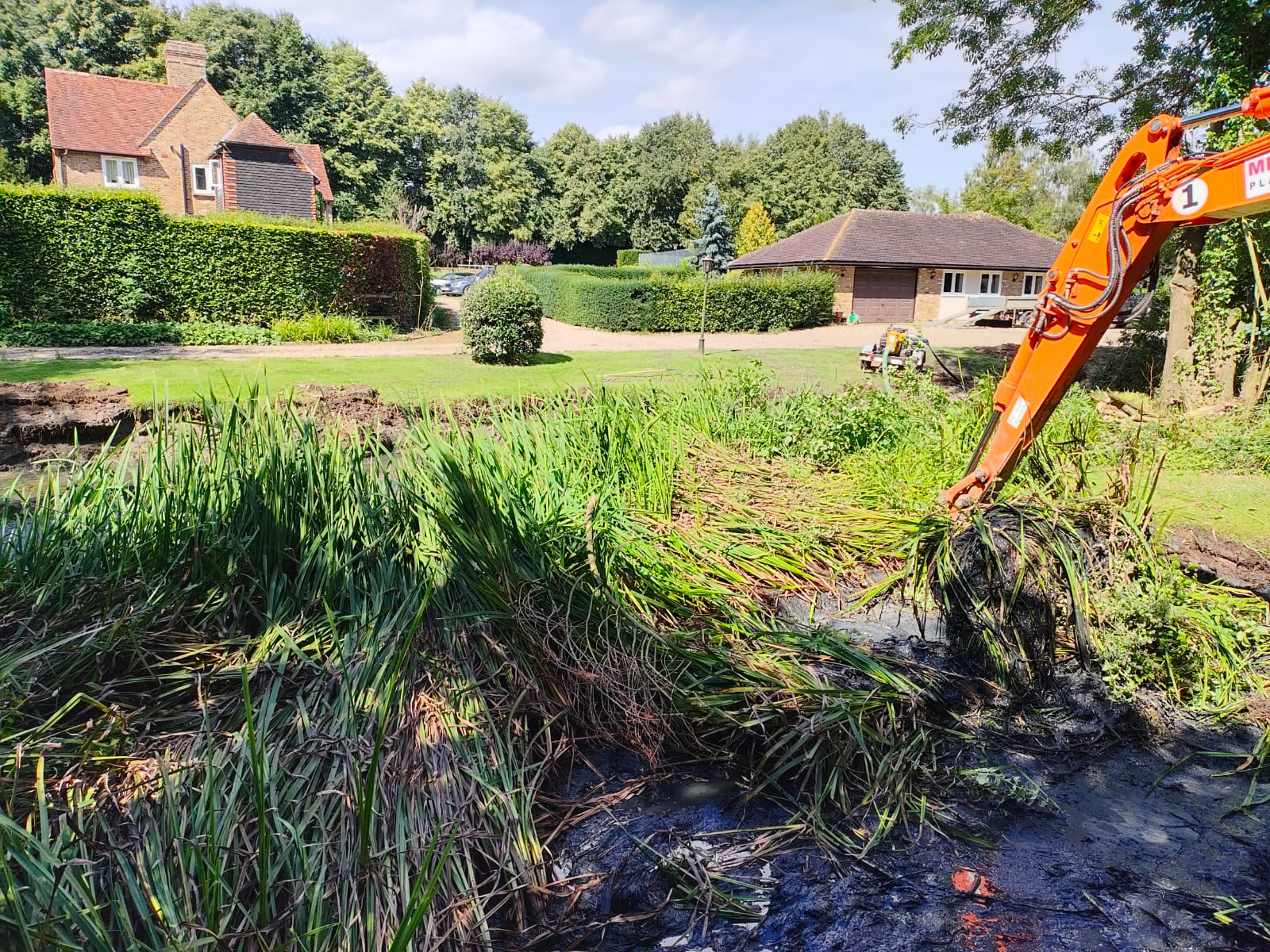Richard and the team pumped the water down then proceeded to remove the reeds and silt using a specialised long reach excavator and a standard excavator.