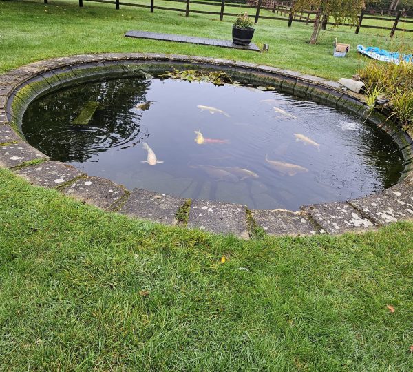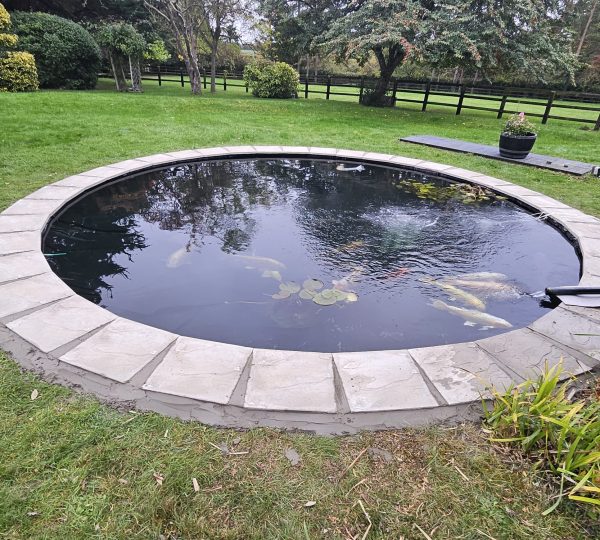 New paving slabs, hand-picked by the client, were supplied and expertly installed around the pond’s perimeter, cemented securely for both aesthetics and safety. The koi were then carefully reintroduced to their refreshed habitat.