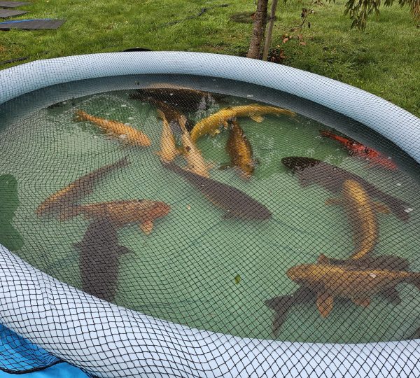 The holding tanks were set up using water from the existing pond to minimise stress and maintain a stable environment for the fish. Each koi was carefully netted and transferred into the tanks with the greatest care and attention.