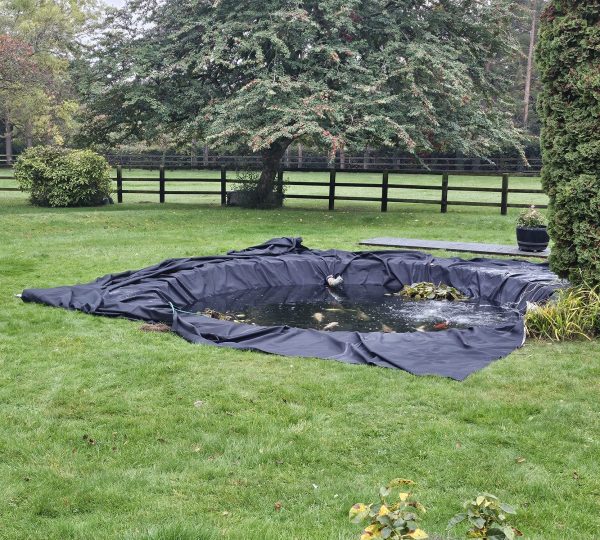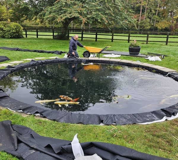 A new E.P.D.M. (Ethylene Propylene Diene Monomer) liner was fitted, and the team began to refill the pond, introducing a dechlorinating solution to safeguard the health of the fish. Throughout the process, the liner was meticulously adjusted to eliminate wrinkles and ensure a smooth, secure fit.