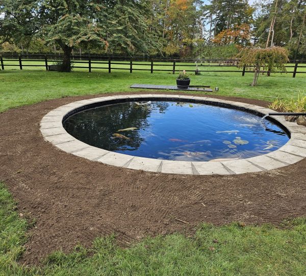 To complete the landscaping, topsoil and grass seed were supplied, spread, and raked around the pond’s edge for a tidy finish. A pond net was installed to provide ongoing safety and security for the fish against potential predators.