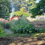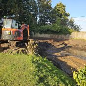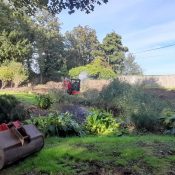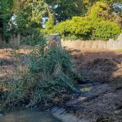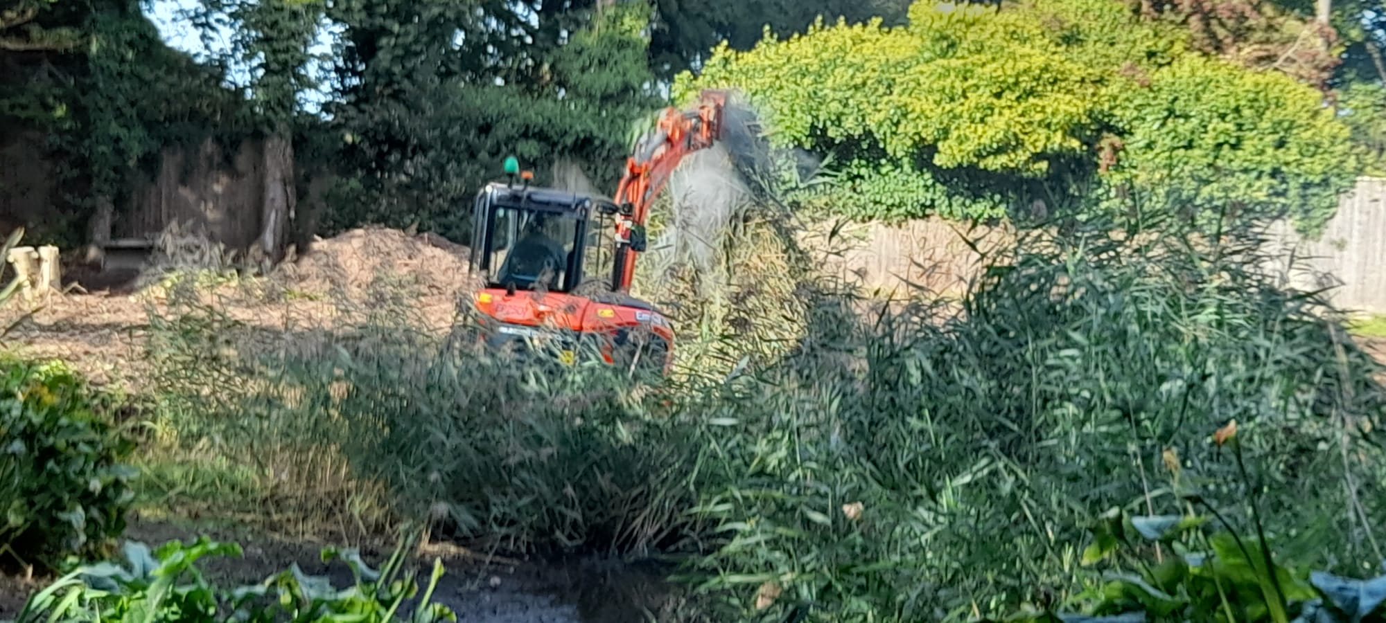 Using the diesel submersible pump, the pond was drained with the water redirected onto the garden area by the boundary. Before dredging could begin, the surrounding landscape required attention. The team utilised chainsaws, pole saws, and hand tools to remove a hedge running alongside the property boundary fence next to the road.